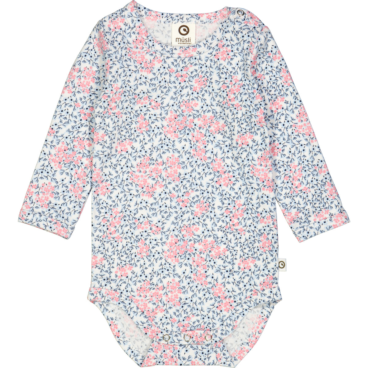Der Langarmbody ist mit einem hübschen Blumenmuster versehen, das über den gesamten Body erstreckt. Er hat lange Ärmel und öffnet sich am Halsausschnitt sowie am unteren Ende mit Druckknöpfen.